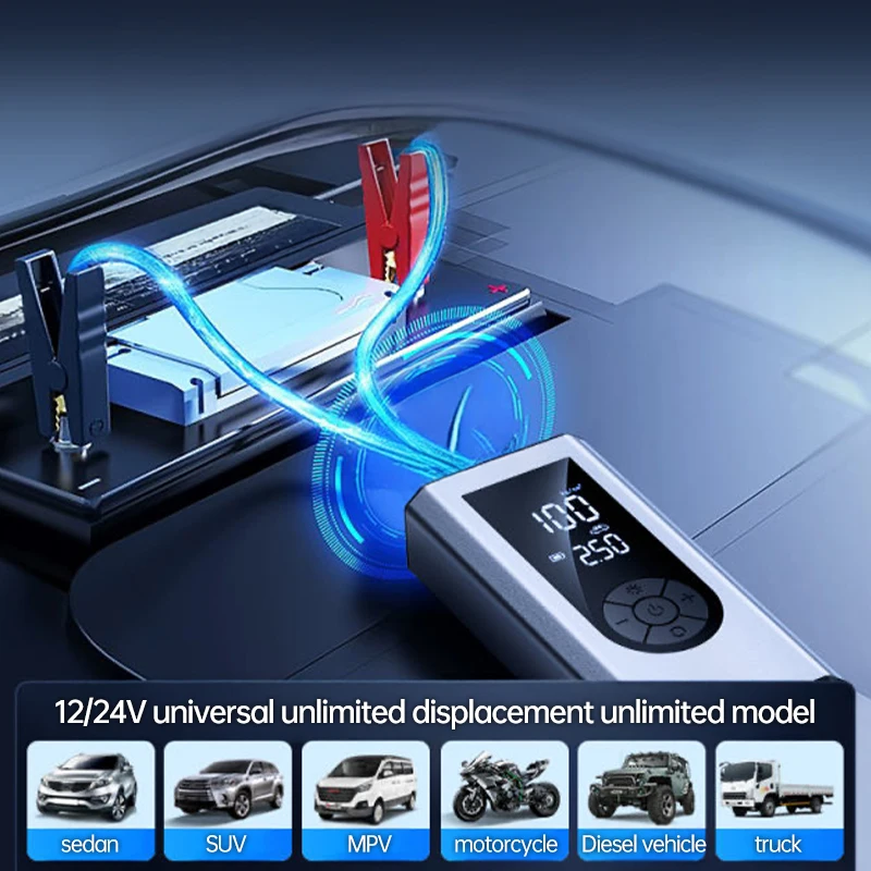 The new JKUOO car battery jumper starter has a powerful maximum current of 2500A, adopts a metal shell design, and a maximum inflation pressure of 10.5 bar. It is designed for most 12V cars and is suitable for gasoline engines below 10.0L and diesel engines below 8.0L. Suitable for cars, pickups, motorcycles, lawn mowers, vans, snowmobiles, etc. With this battery booster, you no longer have to worry about unexpected situations and can start the vehicle in seconds.
